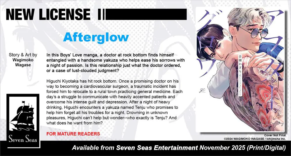 Brand-new license announcement! AFTERGLOW by Wagimoko Wagase. In this Boys’ Love/#BL manga, a doctor at rock bottom finds himself entangled with a handsome yakuza who helps ease his sorrows with a night of passion.