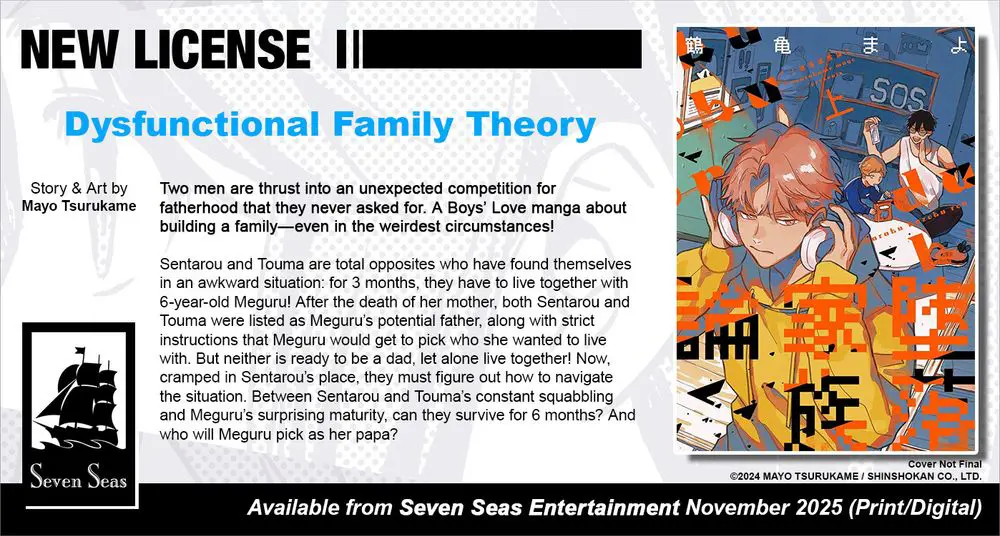 Brand-new license announcement! DYSFUNCTIONAL FAMILY THEORY by Mayo Tsurukame. Two men are thrust into an unexpected competition for fatherhood that they never asked for. A Boys’ Love/#BL manga about building a family—even in the weirdest circumstances!
