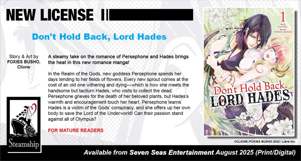 Brand-new license announcement! DON'T HOLD BACK, LORD HADES by FOXIES BUSHO and Clione. This romance manga for the Steamship imprint brings the heat with a new take on the tale of Persephone and Hades—perfect for fans of PERSEPHONE: HADES’ TORMENT!