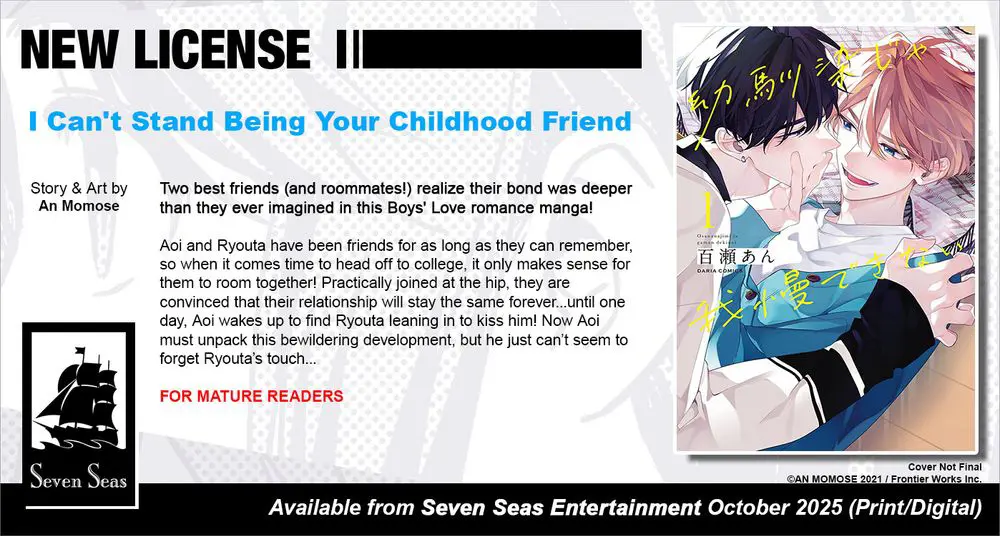 Brand-new license announcement! I CAN'T STAND BEING YOUR CHILDHOOD FRIEND by An Momose. Two best friends (and roommates!) realize their bond is deeper than they ever imagined in this Mature-rated Boys’ Love/#BL romance manga!