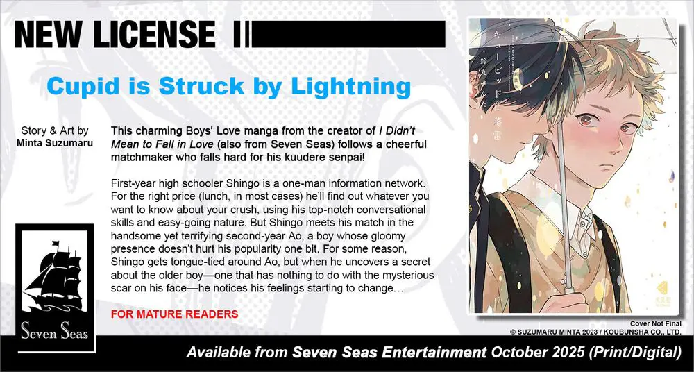 Brand-new license announcement! CUPID IS STRUCK BY LIGHTNING by Minta Suzumaru. This charming Boys’ Love/#BL manga by the creator of I DIDN’T MEAN TO FALL IN LOVE (also from Seven Seas) follows a cheerful matchmaker who falls hard for his kuudere senpai!