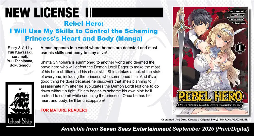 Brand-new license announcement! REBEL HERO: I WILL USE MY SKILLS TO CONTROL THE SCHEMING PRINCESS'S HEART AND BODY (MANGA) by Yuu Kawasaki, soramoti, Yuu Tachibana, and Bokutengou. One man must use his body to survive in this Mature-rated isekai tale!
