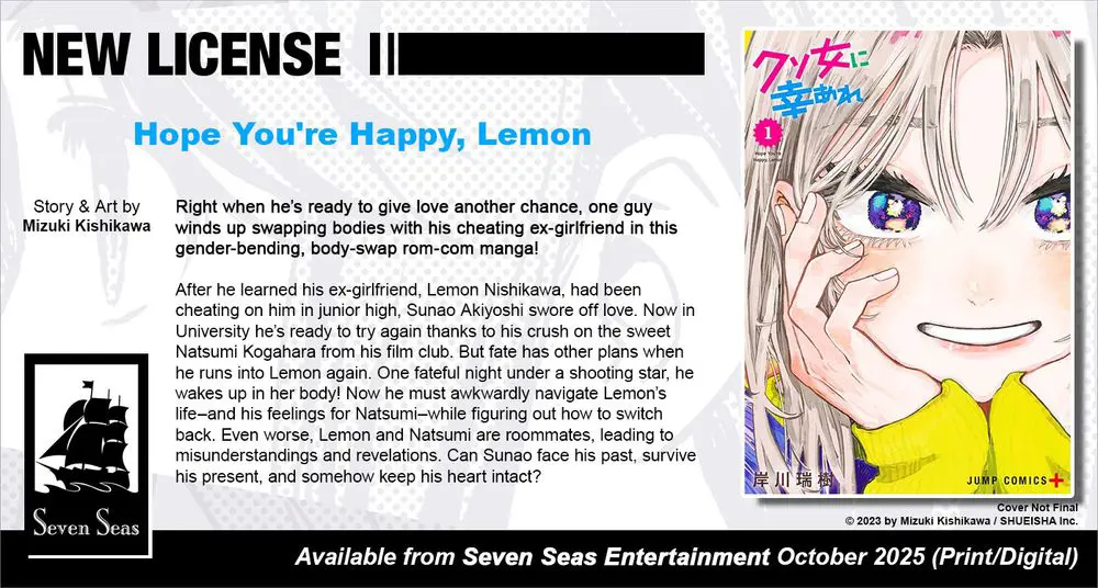 Brand-new license announcement! HOPE YOU'RE HAPPY, LEMON by Mizuki Kishikawa. Right when he’s ready to give love another chance, one guy winds up swapping bodies with his cheating ex-girlfriend in this gender-bending, body-swap rom-com manga!