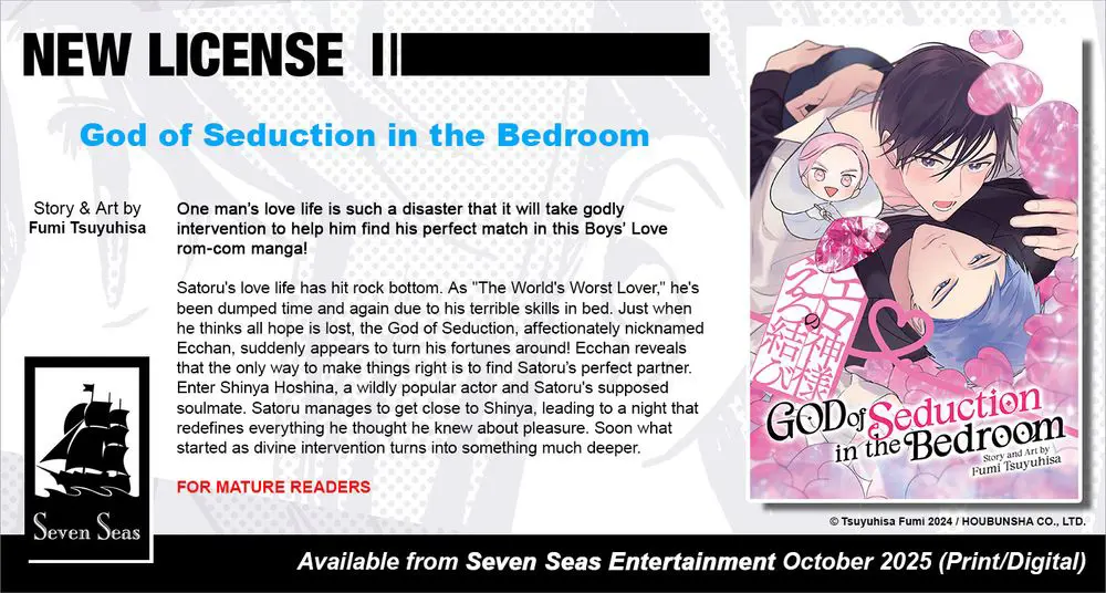 Brand-new license announcement! GOD OF SEDUCTION IN THE BEDROOM by Fumi Tsuyuhisa. One man’s love life is such a disaster that it will take godly intervention to help him find his perfect match in this Boys’ Love / #BL rom-com manga!