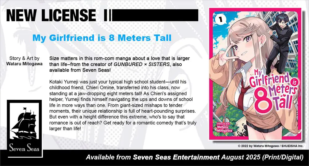Brand-new license announcement! MY GIRLFRIEND IS 8 METERS TALL by Wataru Mitogawa. Size matters in this rom-com manga about a love that is larger than life–from the creator of GUNBURED × SISTERS, also available from Seven Seas!