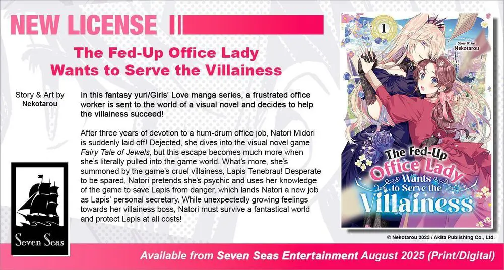 Brand-new license announcement! THE FED-UP OFFICE LADY WANTS TO SERVE THE VILLAINESS by Nekotarou. In this fantasy isekai #yuri / Girls’ Love manga series, an office worker is sent to the world of a visual novel and decides to help the villainess succeed!