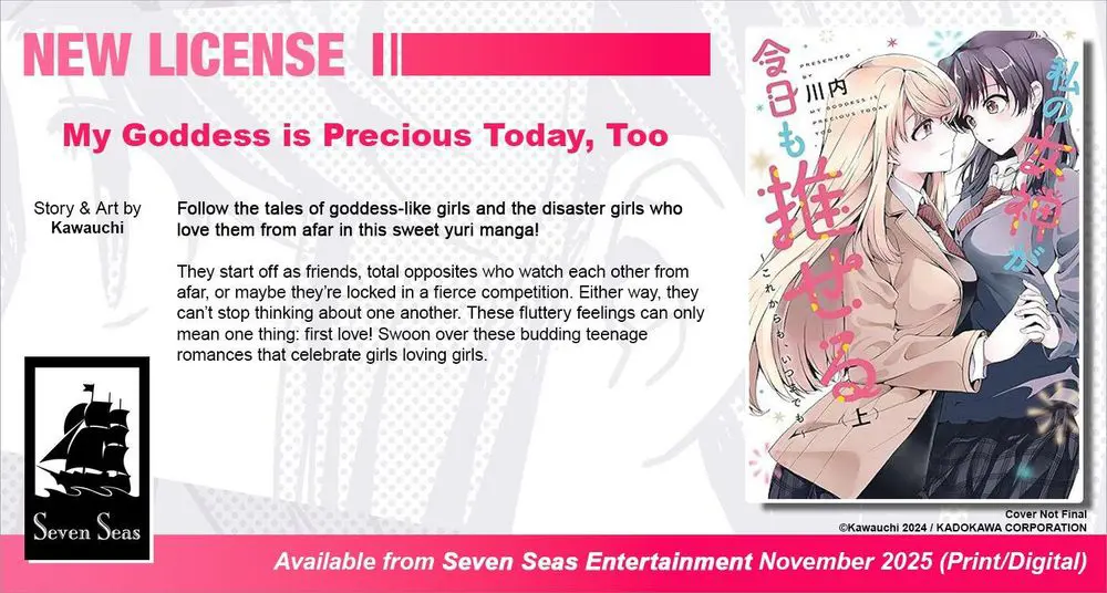 Brand-new license announcement! MY GODDESS IS PRECIOUS TODAY, TOO by Kawauchi. Follow the tales of goddess-like girls and the disaster girls who love them from afar in this sweet