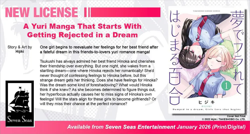 Brand-new license announcement! A YURI MANGA THAT STARTS WITH GETTING REJECTED IN A DREAM by Hijiki. One girl begins to reevaluate her feelings for her best friend after a fateful dream in this friends-to-lovers #yuri / Girls’ Love romance manga!