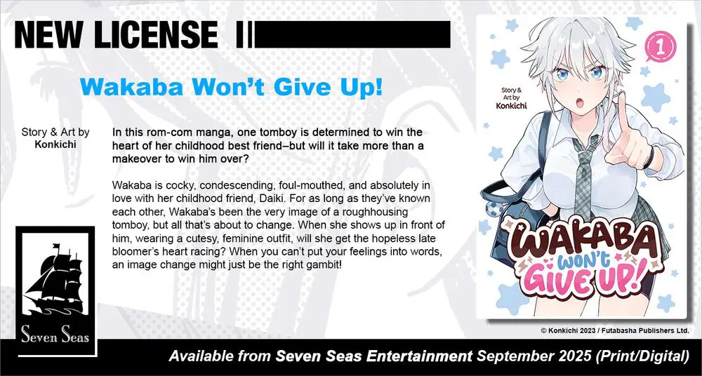 Brand-new license announcement! WAKABA WON’T GIVE UP! by Konkichi. In this rom-com manga, one tomboy is determined to win the heart of her childhood best friend–but will it take more than a makeover to win him over?