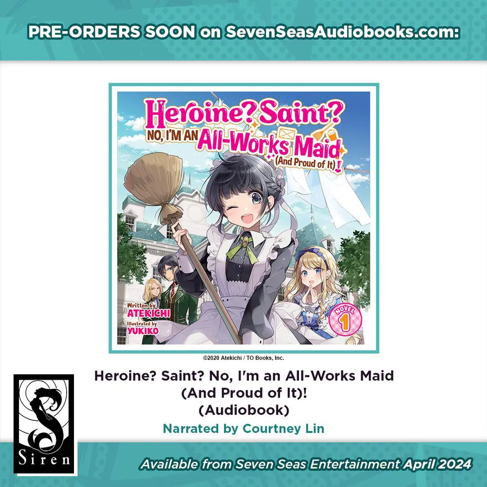 Brand-new license announcement! HEROINE? SAINT? NO, I'M AN ALL-WORKS MAID (AND PROUD OF IT)! (AUDIOBOOK) by Atekichi and Yukiko, narrated by Courtney Lin. See how one maid cleans up her own destiny in this fantasy isekai tale—manga also from Seven Seas!