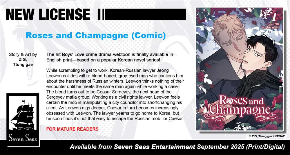 Brand-new license announcement! ROSES AND CHAMPAGNE (COMIC) by ZIG and Ttung gae. The hit Boys’ Love / #BL crime drama webtoon is finally available in English print—based on a popular Korean novel series!