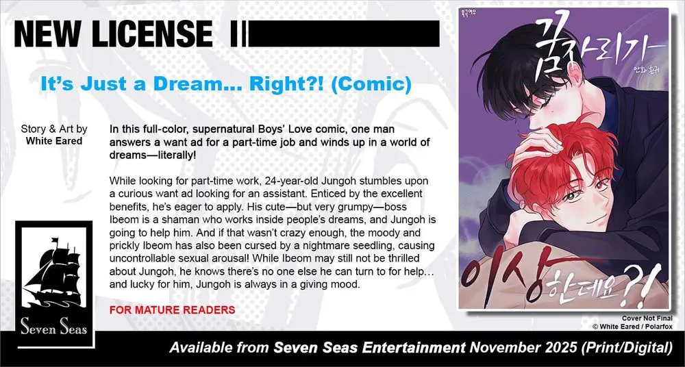 Brand-new license announcement! IT’S JUST A DREAM… RIGHT?! (COMIC) by White Eared. In this full-color, supernatural Boys’ Love / #BL comic, one man answers a want ad for a part-time job and winds up in a world of dreams—literally!