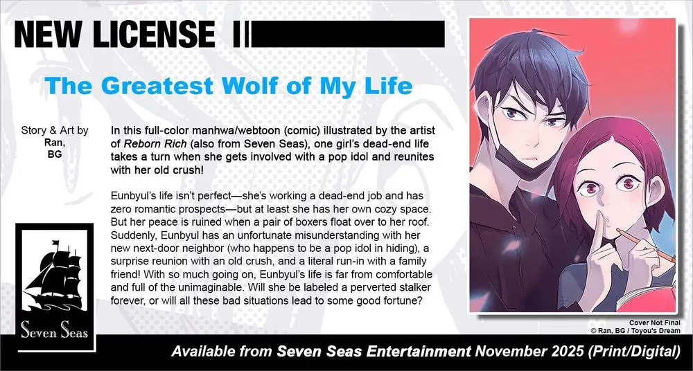 Brand-new license announcement! THE GREATEST WOLF OF MY LIFE by Ran and BG. In this full-color comic illustrated by the artist of REBORN RICH, one girl’s dead-end life takes a turn when she gets involved with a pop idol and reunites with her old crush!