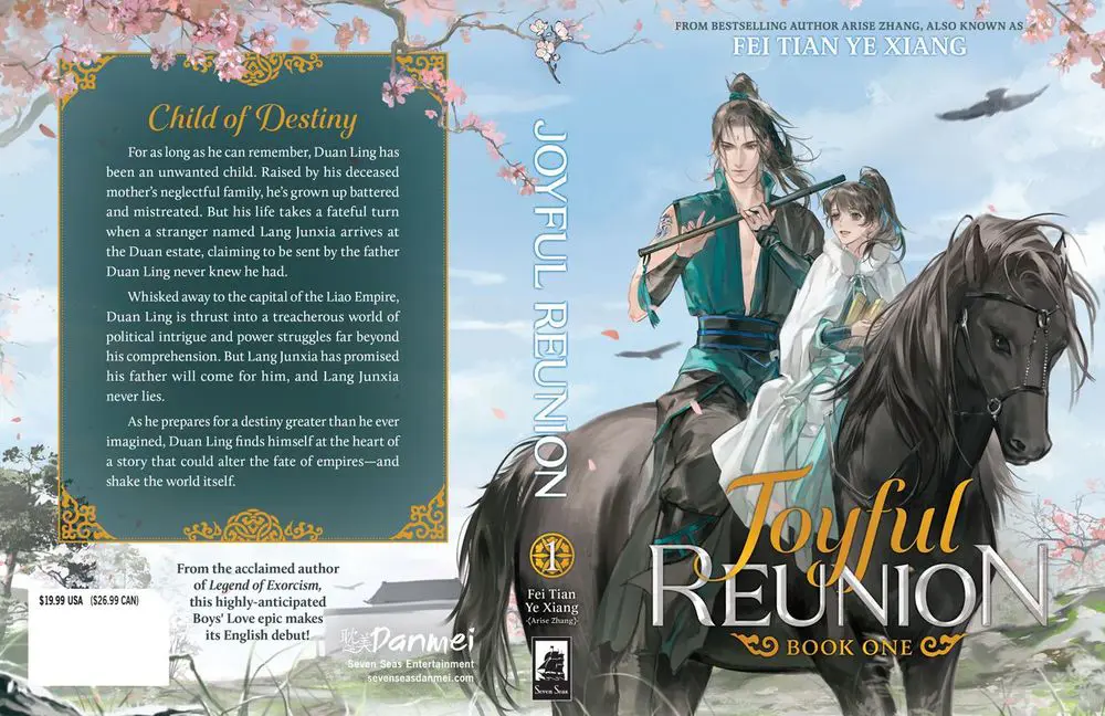 New #danmei cover reveal! ✨ JOYFUL REUNION (NOVEL) Vol. 1 by Arise Zhang, also known as Fei Tian Ye Xiang (非天夜翔); cover art by Porridge, and interior art by Qiangtou (墙头)!