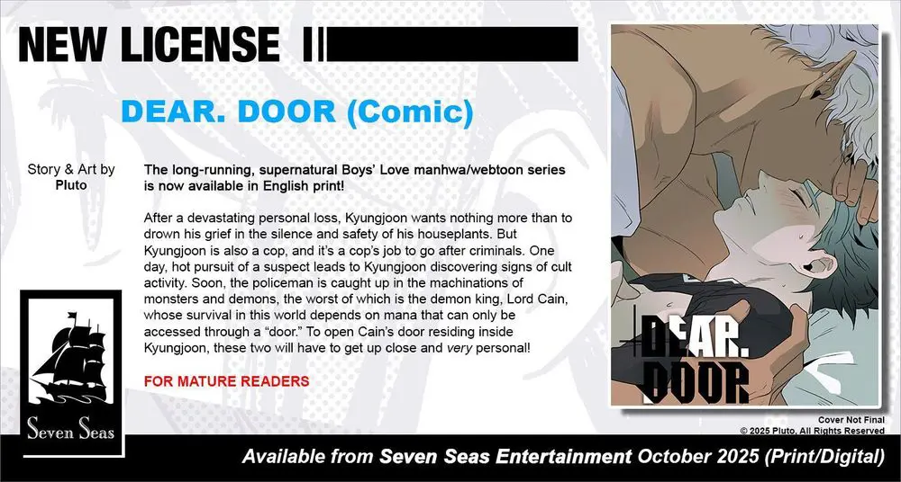 Brand-new license announcement! DEAR. DOOR (Comic) by Pluto. In this supernatural crime-drama Boys’ Love / #BL manhwa series, a cop in mourning gets caught up in a demonic scheme that has him working with a demon king! #SevenSeasWebtoons