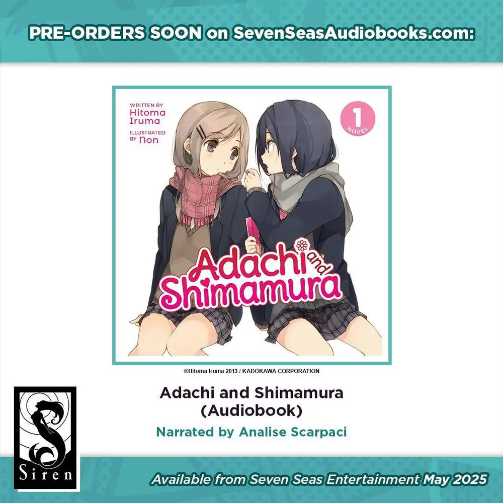 Brand-new license announcement! ADACHI AND SHIMAMURA (AUDIOBOOK) by Hitoma Iruma, raemz, and Non, narrated by Analise Scarpaci. The light novels about a sweet romance between high school girls–now an anime series!