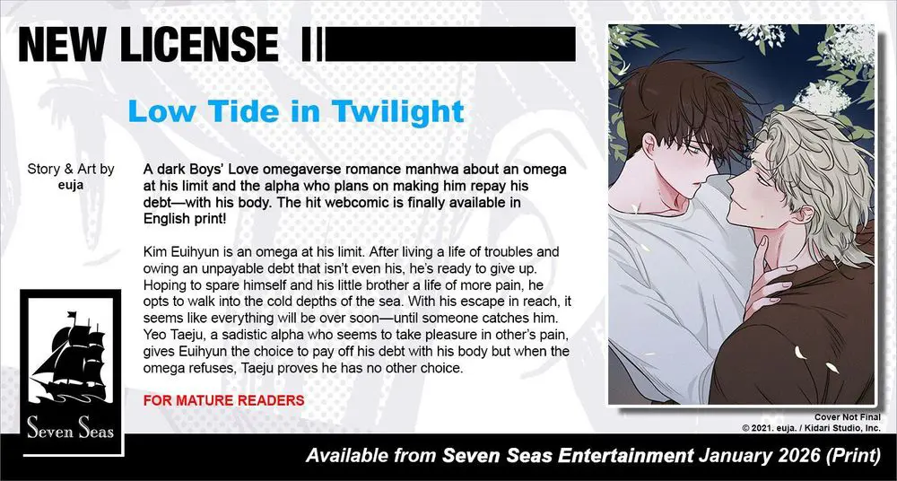 Brand-new license announcement! LOW TIDE IN TWILIGHT by euja. A dark Boys’ Love / #BL #omegaverse manhwa (comic) about an omega at his limit and the alpha who plans on making him repay his debt—with his body. #SevenSeasWebtoons