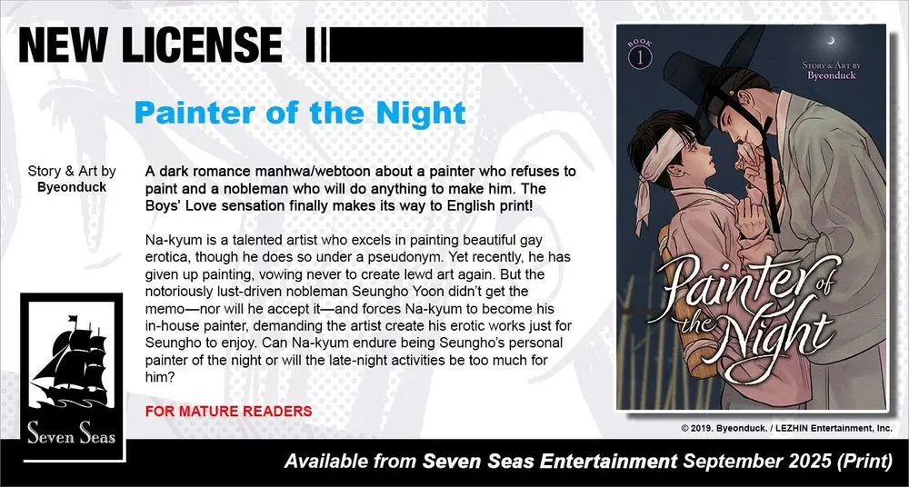 Brand-new license announcement! PAINTER OF THE NIGHT by Byeonduck. The full-color Boys’ Love / #BL manhwa (comic) sensation—finally in English print! Don't miss this popular dark romance about a talented artist and a stubborn nobleman. #SevenSeasWebtoons