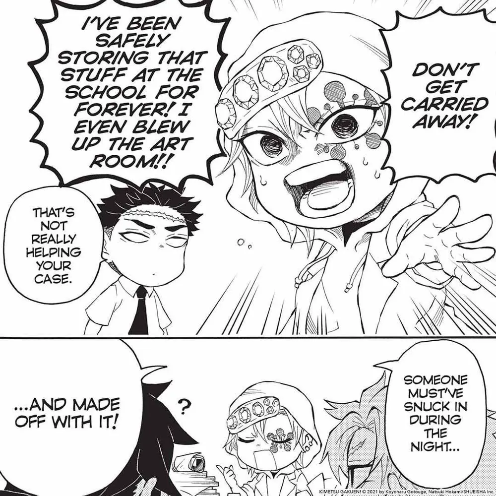 Tengen’s defense strategy: confessing to blowing up the art room...😂 (via Demon Slayer: Kimetsu Academy, Vol. 5)