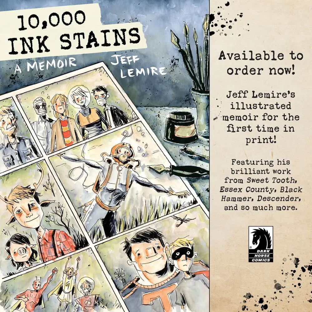 10,000 Ink Stains, a hardcover memoir collection showcasing the work of legendary Eisner award-winning comic book creator @jefflemire171.bsky.social, is now available to pre-order: bit.ly/4j0Vi1q