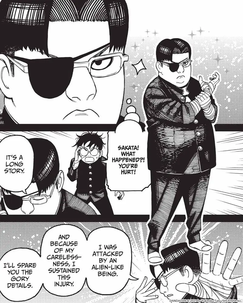 Sakata shows off his new, very real battle scars 👁️ (via Dandadan, Vol. 12)