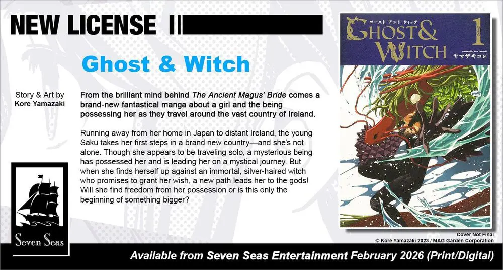 Brand-new license announcement! GHOST AND WITCH by Kore Yamazaki. From the brilliant mind behind THE ANCIENT MAGUS’ BRIDE comes a brand-new fantastical manga about a girl and the being possessing her as they travel around the vast country of Ireland.