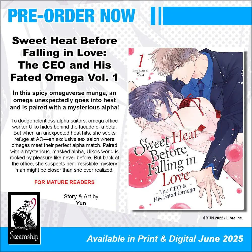 A Mature-rated #omegaverse manga for the Steamship imprint about an office worker omega and the mysterious masked alpha she gets paired with!
