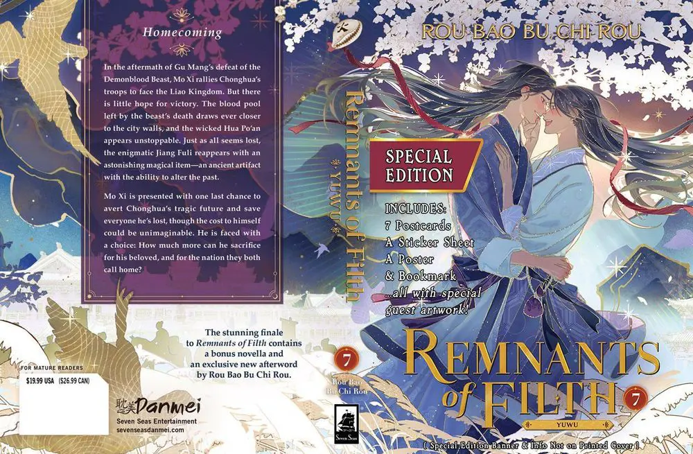 FINAL VOLUME! Limited (one print only). Reg Ed book + merch by guest artists: poster, postcards, sticker sheet, bookmark! For Mature readers. #SevenSeasDanmei #RemnantsOfFilth