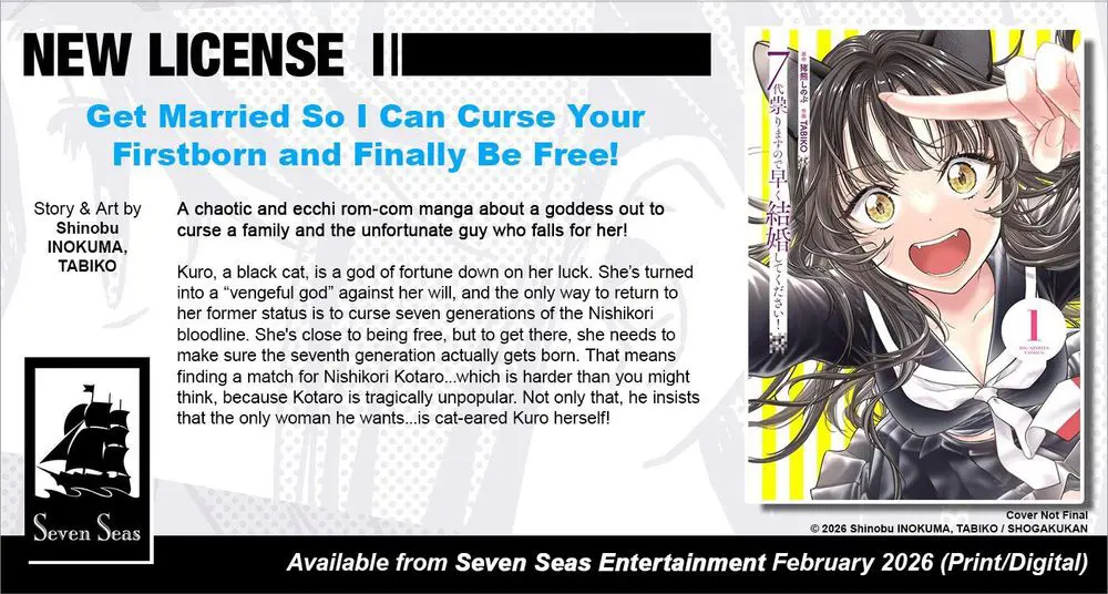 Brand-new license announcement! GET MARRIED SO I CAN CURSE YOUR FIRSTBORN AND FINALLY BE FREE! by Shinobu INOKUMA and TABIKO. A chaotic and ecchi rom-com manga about a goddess out to curse a family and the unfortunate guy who falls for her!