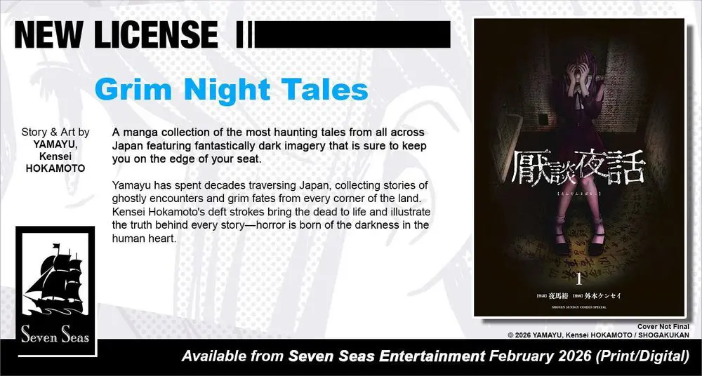 Brand-new license announcement! GRIM NIGHT TALES by YAMAYU and Kensei HOKAMOTO. A manga collection of the most haunting tales from all across Japan featuring fantastically dark imagery that is sure to keep you on the edge of your seat.