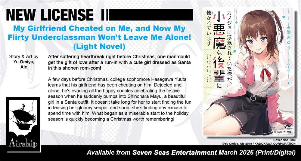 Brand-new license announcement! MY GIRLFRIEND CHEATED ON ME, AND NOW MY FLIRTY UNDERCLASSMAN WON’T LEAVE ME ALONE! (LIGHT NOVEL) by Yu Omiya and Ale. One man could get the gift of love after a run-in with a girl dressed as Santa in this shonen rom-com!