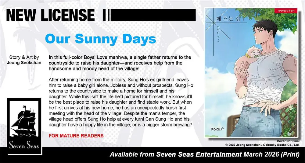 Brand-new license announcement! OUR SUNNY DAYS by Jeong Seokchan. In this full-color Boys’ Love / #BL manhwa, a single father returns to the countryside to raise his daughter—and receives help at every turn from the handsome and moody head of the village!
