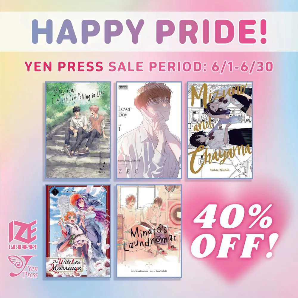 Happy Pride Month! 🥳 For the entire month, we're celebrating Pride with sales on your favorite GL and BL titles! Grab Lover Boy, This Monster Wants to Eat Me, Minato's Laundromat, and more! Happy Pride Month!