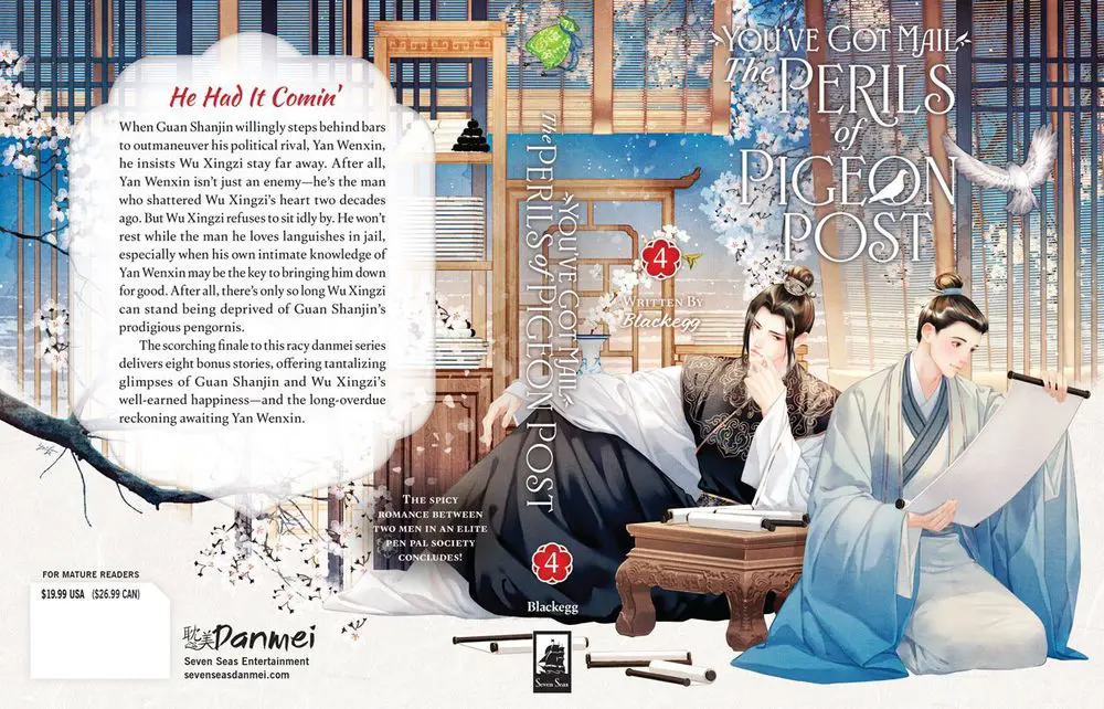 New #danmei cover reveal! ✨ YOU’VE GOT MAIL: THE PERILS OF PIGEON POST – FEI GE JIAO YOU XU JIN SHEN (NOVEL) Vol. 4 by Blackegg, the series finale with cover art by Leila + interior art by Ninemoon! #SevenSeasDanmei
