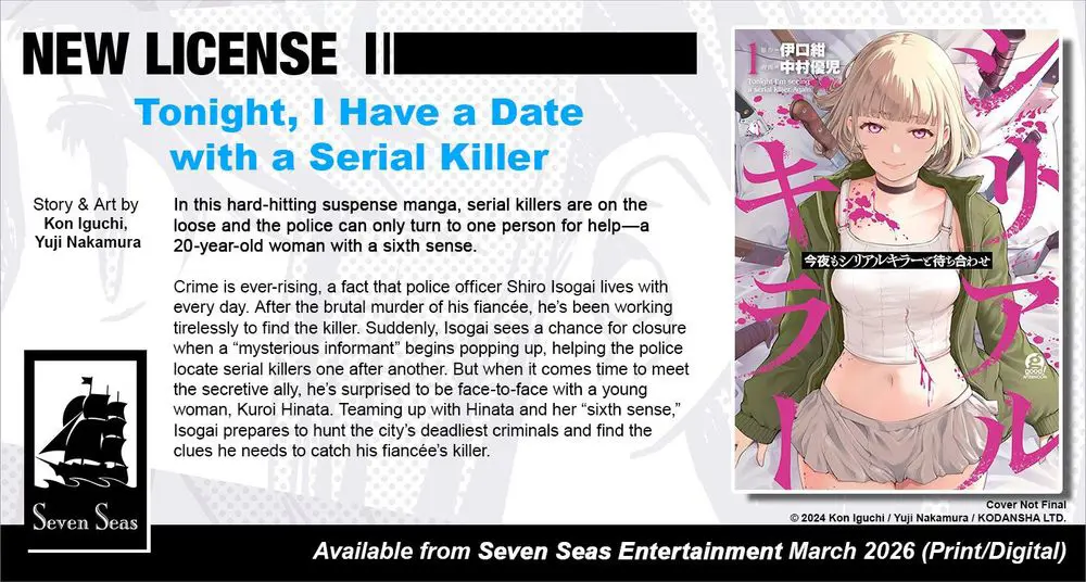 Brand-new license announcement! TONIGHT, I HAVE A DATE WITH A SERIAL KILLER by Kon Iguchi and Yuji Nakamura. In this thrilling suspense manga, serial killers are on the loose. Can one 20-year-old woman with a sixth sense help the police track them down?