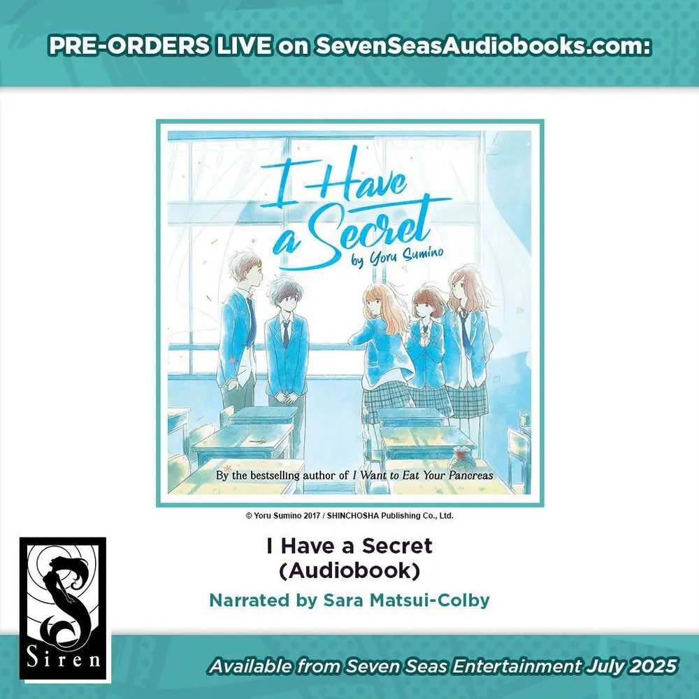 Brand-new license announcement! I HAVE A SECRET (AUDIOBOOK) by Yoru Sumino, narrated by Sara Matsui-Colby. A coming-of-age novel with supernatural overtones from the bestselling author of I WANT TO EAT YOUR PANCREAS!