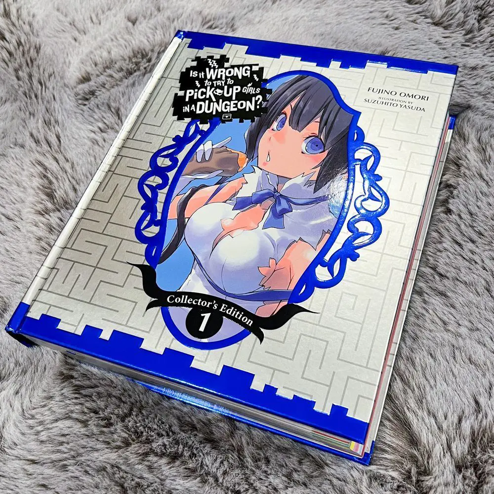 The collector's edition of Is It Wrong to Try to Pick Up Girls in a Dungeon? includes silver edge-painting, shining hardcover binding, and a bookmark ribbon in Hestia's iconic blue color!