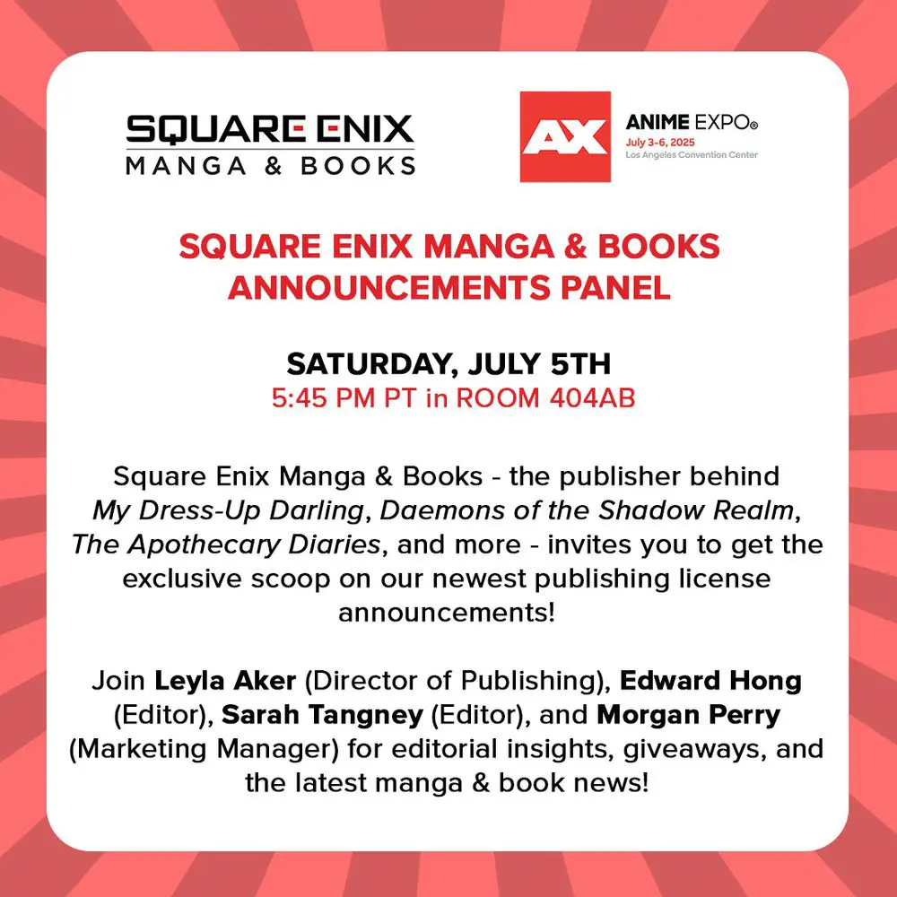 Join Leyla Aker, @edomonogatari.bsky.social, @sarasaraht.bsky.social, and @geauxta.bsky.social on Saturday, 7/5 at 5:45PM PT in Room 404AB for the inside scoop on our newest licensing announcements, giveaways, and a few surprises! ✨