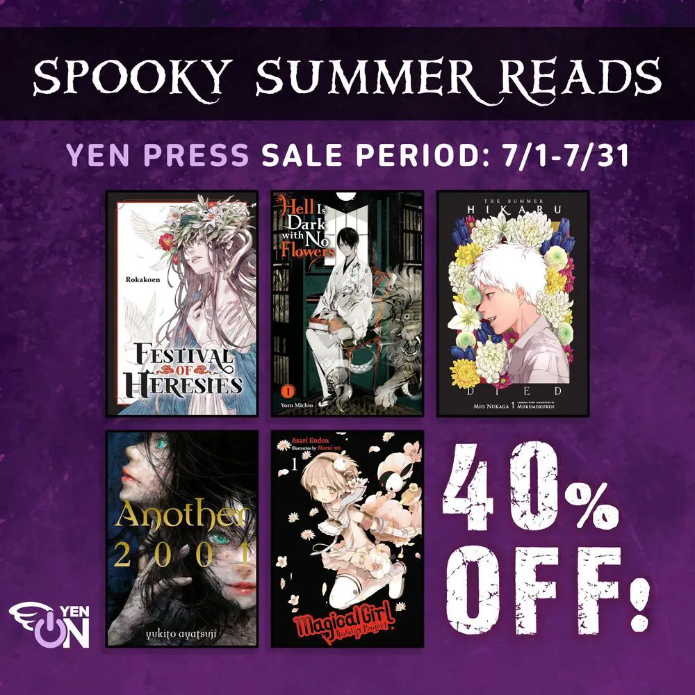 If you're burning up in the sweltering heat, try out this all natural remedy for getting cool: reading some bone-chilling stories! Get huge discounts on Another 2001, The Summer Hikaru Died (novel), and Hell is Dark with No Flowers!