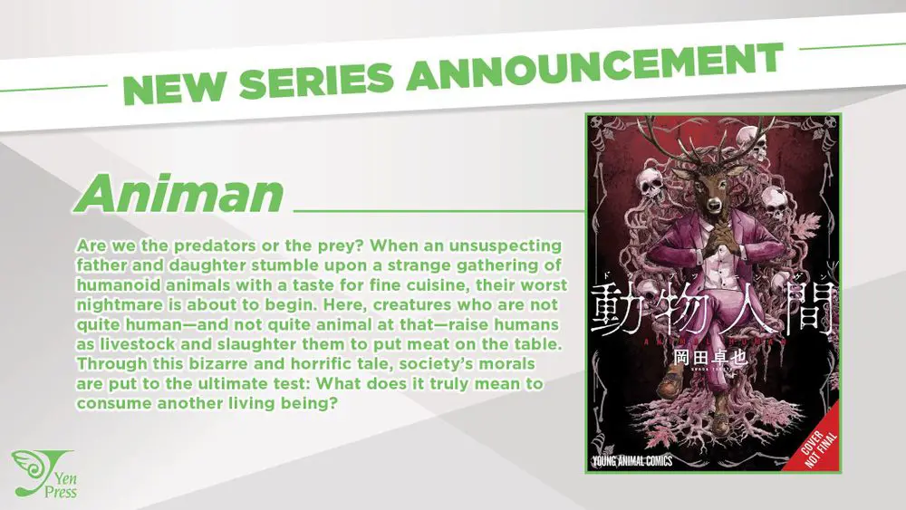 An unsuspecting father and daughter stumble upon a strange gathering of animals with a taste for fine cuisine. Here, creatures who are not quite human—and not quite animal at that—raise humans as livestock and slaughter them to put meat on the table.