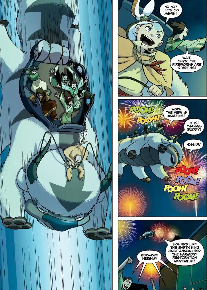 Panel is from Avatar: The Last Airbender—The Promise, now collected in an Omnibus paperback edition, by Bryan Konietzko, Michael Dante DiMartino, and @geneluenyang.bsky.social, with art by @gurihiru.bsky.social. With Avatar Studios.