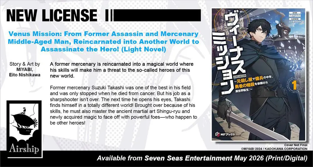 Brand-new license announcement! VENUS MISSION: FROM FORMER ASSASSIN AND MERCENARY MIDDLE-AGED MAN, REINCARNATED INTO ANOTHER WORLD TO ASSASSINATE THE HERO! (LIGHT NOVEL) by MIYABI and Eito Nishikawa. A former sharpshooter must fight heroes in a new world!