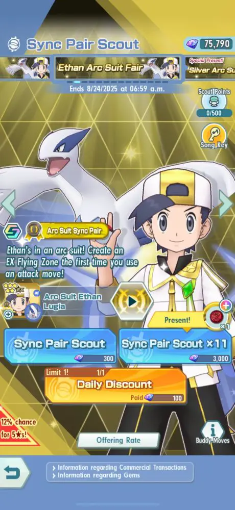 Serebii Update: Pokémon Masters EX has begun the Ethan (Arc Suit) & Lugia Arc Suit Fair scout. Runs until August 24th 2025