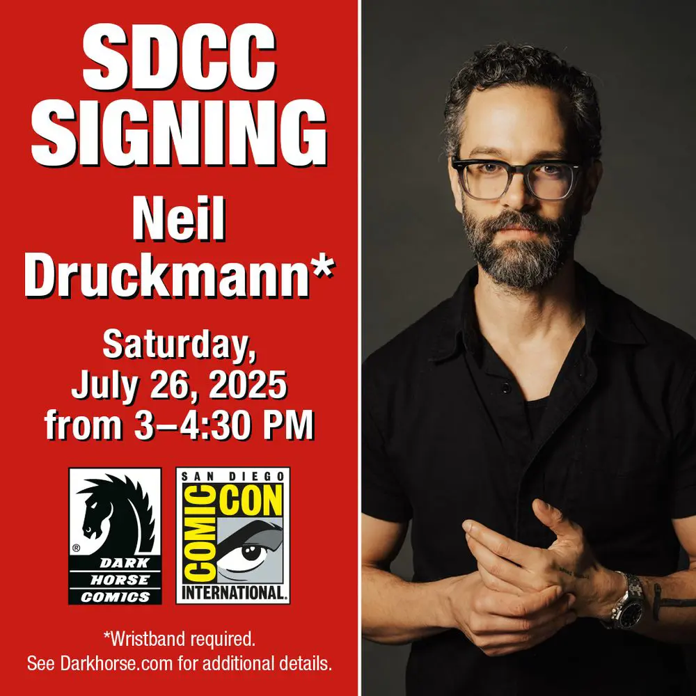 Don't miss @druckmann.bsky.social at the Dark Horse SDCC booth #2615 this Saturday, July 26 from 3-4:30 PM! Wristbands required for entry. See our schedule for more details: bit.ly/4lUh47Z