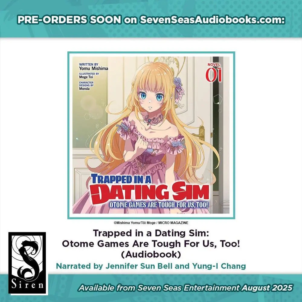 Brand-new license announcement! TRAPPED IN A DATING SIM: OTOME GAMES ARE TOUGH FOR US, TOO! (AUDIOBOOK) by Yomu Mishima, Moge Tōi, and Monda, narrated by Jennifer Sun Bell and Yung-I Chang. An AU spin-off for the hit isekai franchise with an anime!