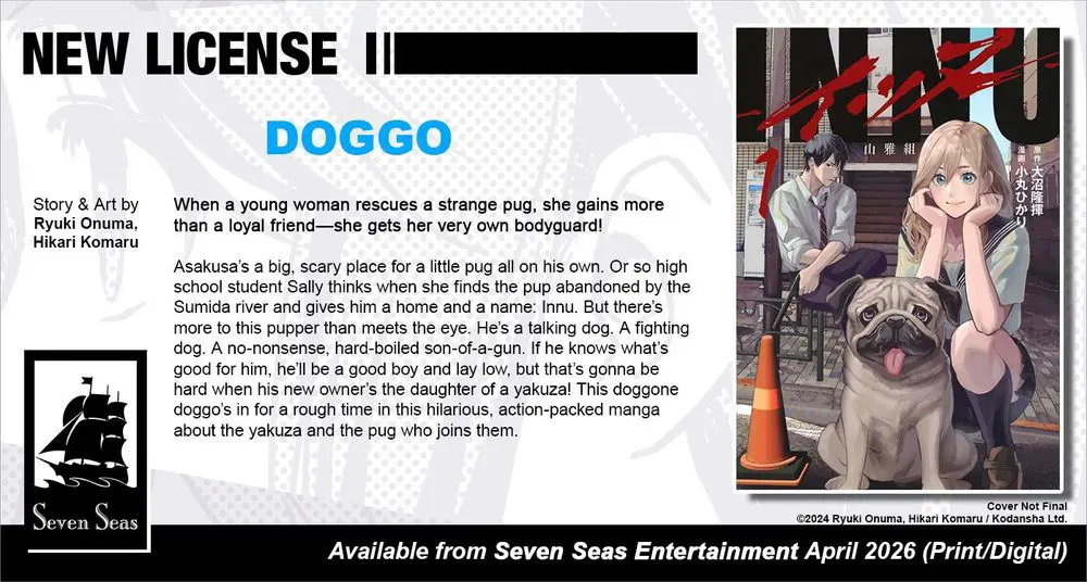 Brand-new license announcement! DOGGO by Ryuki Onuma and Hikari Komaru. When a young woman rescues a strange pug, she gains a loyal bodyguard in this hilarious, action-packed manga!