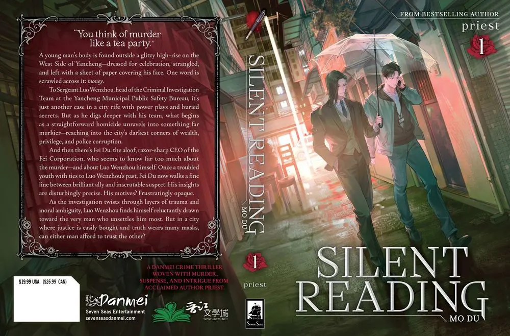 New #SevenSeasDanmei cover reveal! ✨ SILENT READING: MO DU (NOVEL) Vol. 1, the #danmei crime thriller written by bestselling author priest—cover and interior art by Rylee! #SilentReading #MoDu