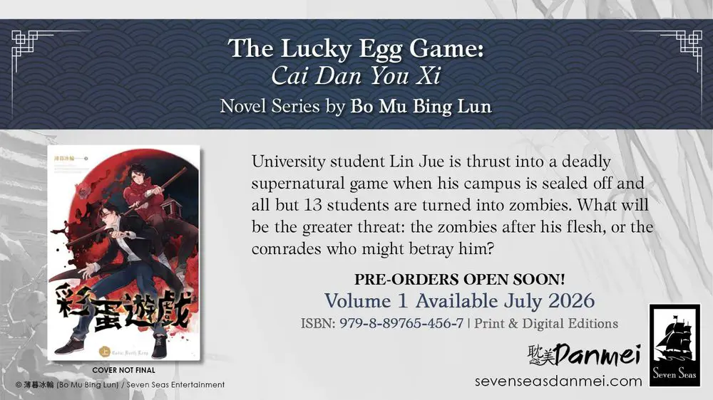 Brand-new license announcement! THE LUCKY EGG GAME: CAI DAN YOU XI (NOVEL) by Bo Mu Bing Lun. Two young men must survive a deadly supernatural game in this action-packed #danmei / Boys' Love series! #SevenSeasDanmei