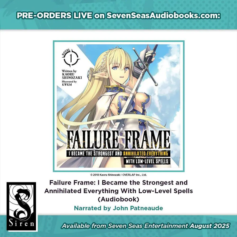 Brand-new license announcement! FAILURE FRAME: I BECAME THE STRONGEST AND ANNIHILATED EVERYTHING WITH LOW-LEVEL SPELLS (AUDIOBOOK) by Kaoru Shinozaki and KWKM, narrated by John Patneaude. The isekai fantasy with an anime—manga also from Seven Seas!