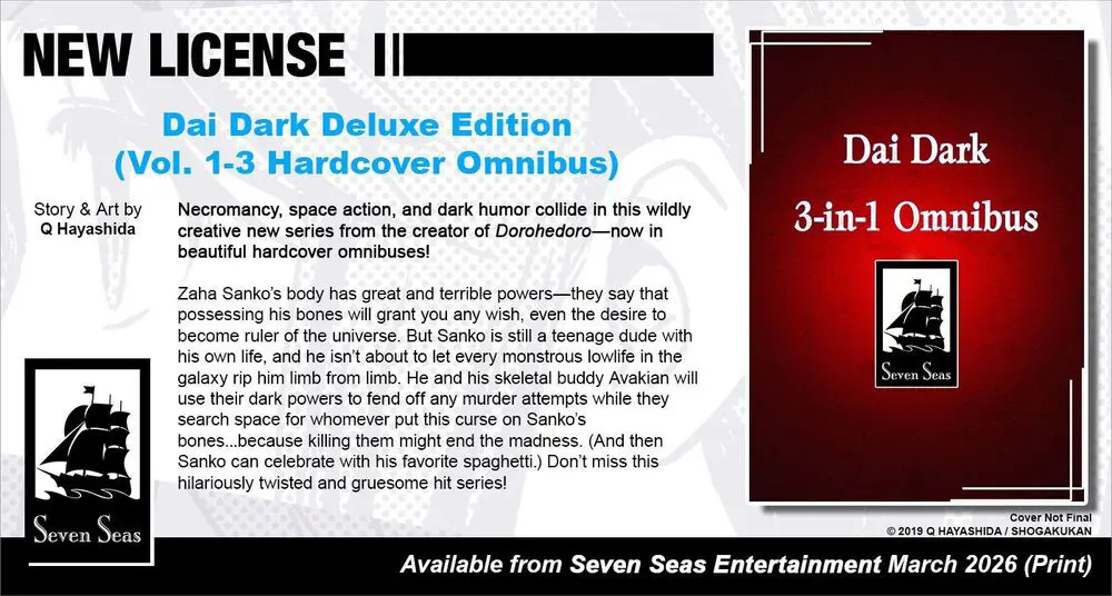 Brand-new license announcement! DAI DARK DELUXE EDITION (VOL. 1-3 HARDCOVER OMNIBUS) by Q Hayashida. Necromancy, space action, and dark humor collide in this wildly creative new manga from the creator of DOROHEDORO—now in beautiful hardcover omnibuses!